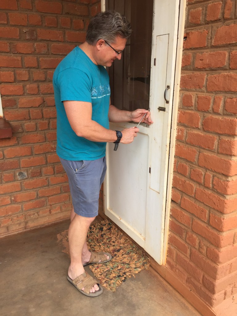 Stocking the kitchen after our big shopping day in Livingstone. We can go to Spar (a grocery store) in Choma about an hour away while some local vegetables are available in the nearby market Fixing the front door screen to keep out the mosquitoes and other flying invaders Handing out biscuits to some of the local boys who come looking for food and water. Maggie decided to take advantage of the time to work on her Tonga and learn new words.